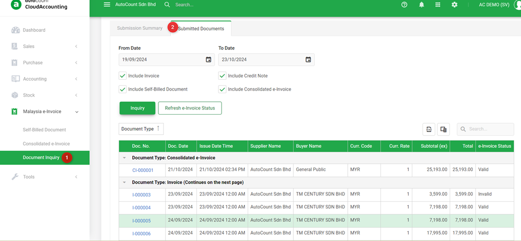 Under Document Inquiry, we had added two new functions 'Submission Summary’ and ‘Submitted Documents’ to keep track of e-Invoice submission records.