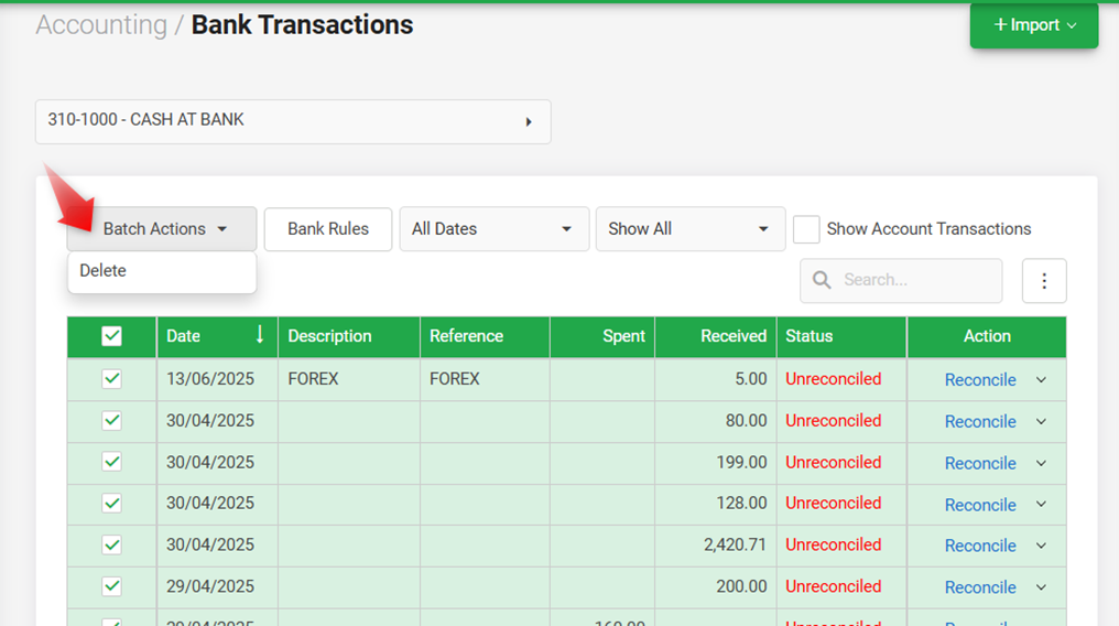 Wrongly imported bank transactions? Fear not – easily select and delete them.
