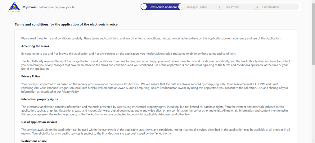 7. It will prompt you for first time self-register taxpayer profile page. Scroll to the bottom and tick accept on the terms and condition check box and click “Continue”.