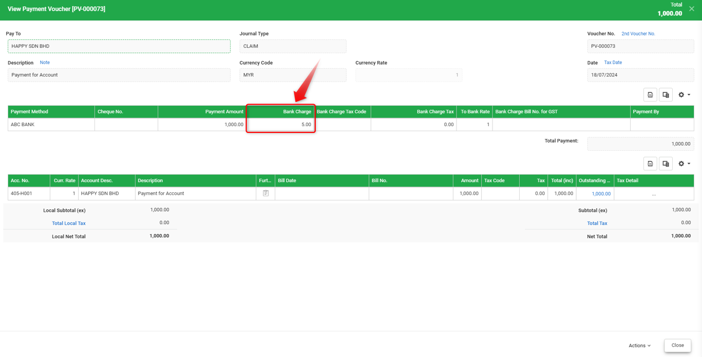 4) After done, go back to the transaction, edit and rekey in bank charges and click on Save.