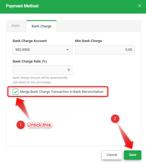 3) Untick ‘Merge Bank Charge Transactions In Bank Reconciliation’ and click Save.