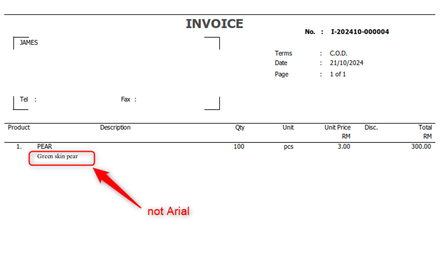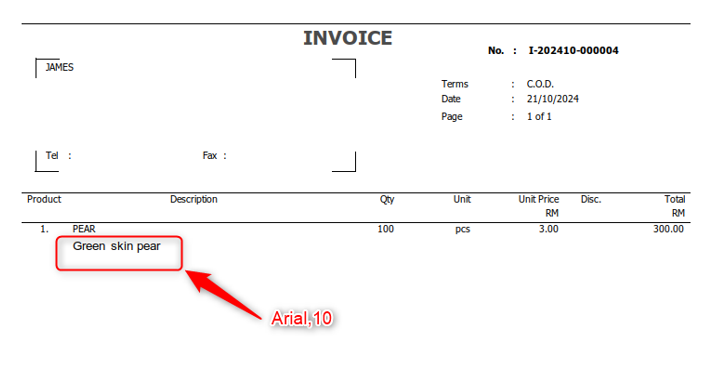2) Highlight the wordings> Select Font Type, and the Size needed. In this example select Font Type Arial, Font Size 10, proceed to click Save, and save the transaction.