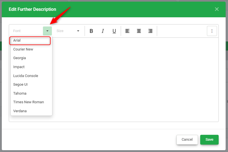 For Further Description field, you need to change the Font Type and Font Size in the Further Description field when you key in transactions.