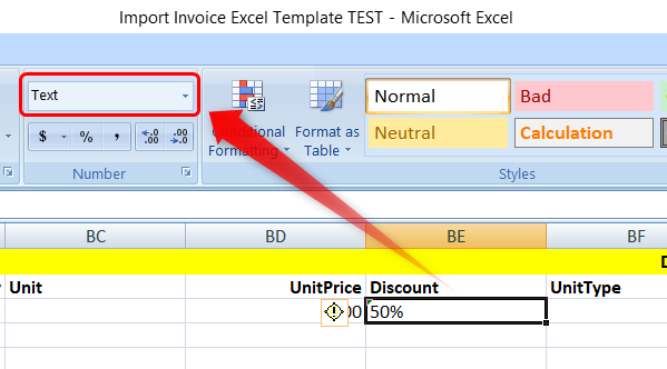 Before importing, change the Discount field to Text format and re-enter the percentage value (e.g. 50%), then run the import again.