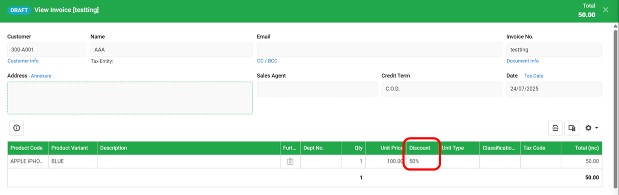 When I import a discount as 50%, it shows as 0.5 in the Invoice. How can I fix this?
